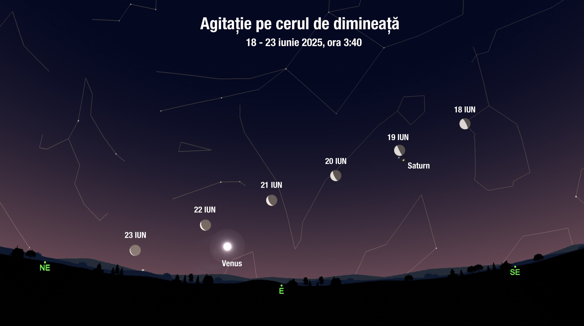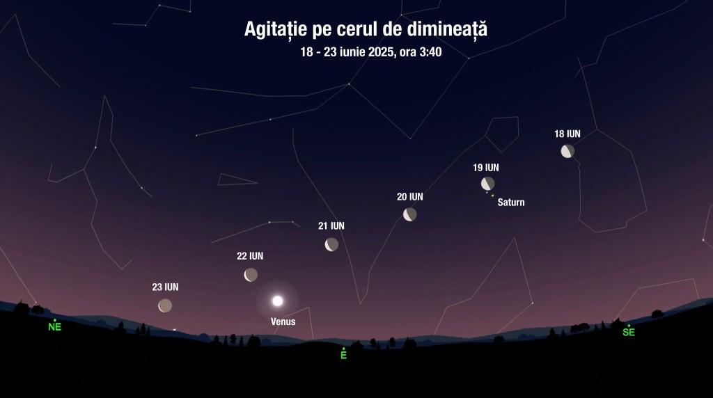 June 16, 2025October 10, 2025 sonkab Agitație pe cerul de dimineață Urmează câteva dimineți agitate, când Luna în scădere trece pe lângă Saturn și Venus. De văzut înspre est, pe la ora 4 dimi. Cer senin! Share this: Click to email a link to a friend (Opens in new window) Email Click to share on Facebook (Opens in new window) Facebook Click to share on X (Opens in new window) X Like Loading... Related