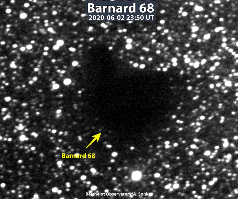 Este norul întunecat Barnard 68 din constelația Ophiucus, situat atât de departe încât întunericul său face 400 de ani până la noi. Un nor ca acesta este compus din atomi și molecule, materiale din care se formează stelele și planetele.