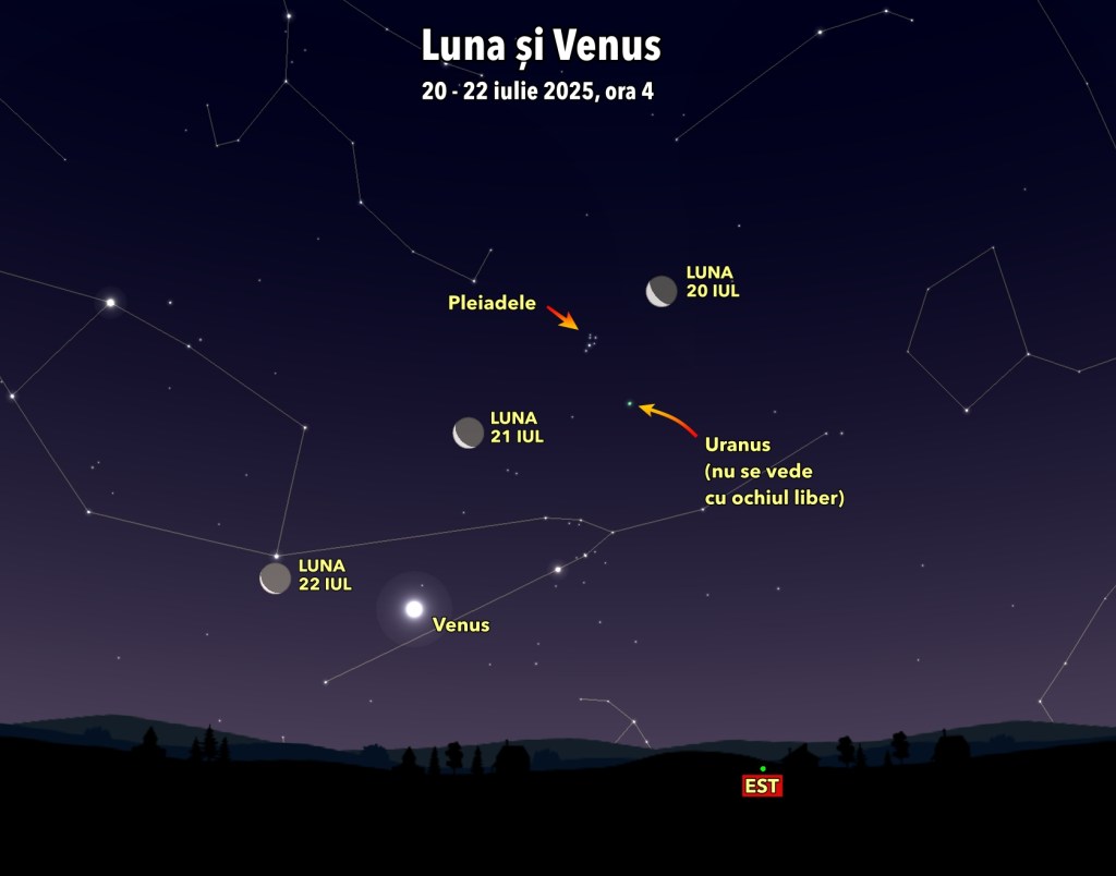 Pe 20, 21 și 22 iulie, secera subțire a Lunii va trece pe lângă Pleiade și Venus. De văzut pe la ora 4 dimineața, înspre est.
