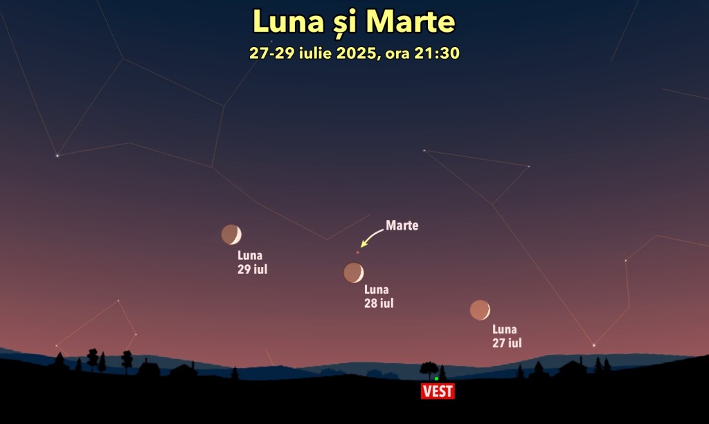 July 27, 2025July 26, 2025 sonkab Luna și Marte În următoarele seri secera subțire a Lunii se va afla în preajma planetei Marte. De văzut pe la ora 21:30, înspre vest, nu foarte sus pe cer. Screenshot Share this: Click to email a link to a friend (Opens in new window) Email Click to share on Facebook (Opens in new window) Facebook Click to share on X (Opens in new window) X Like Loading... Related