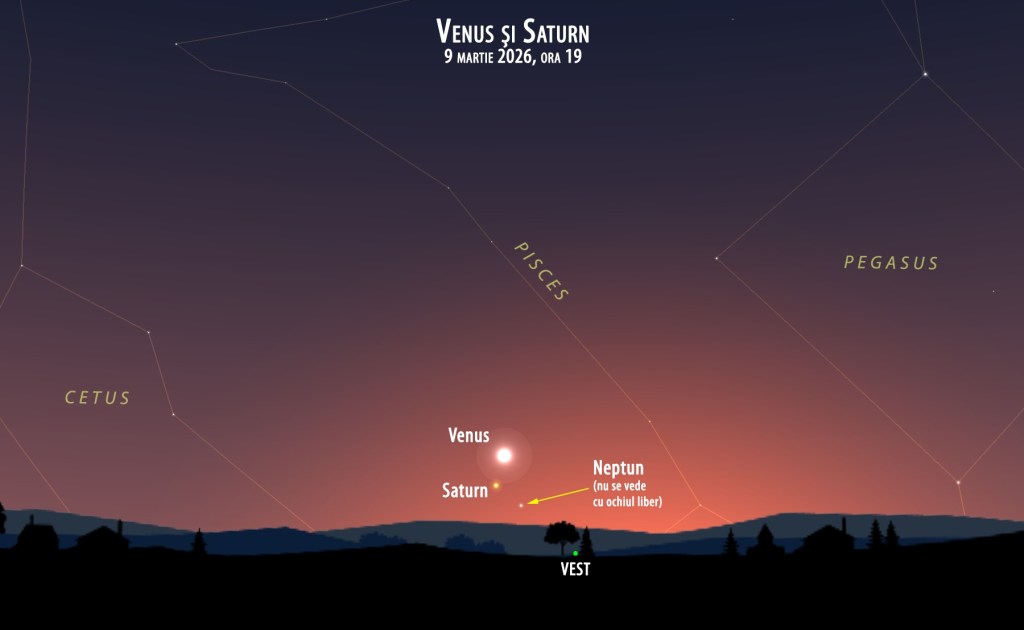 - de Saturn în serile de 6 – 9 martie; se văd la apus, jos pe cer, în jurul orei 18;