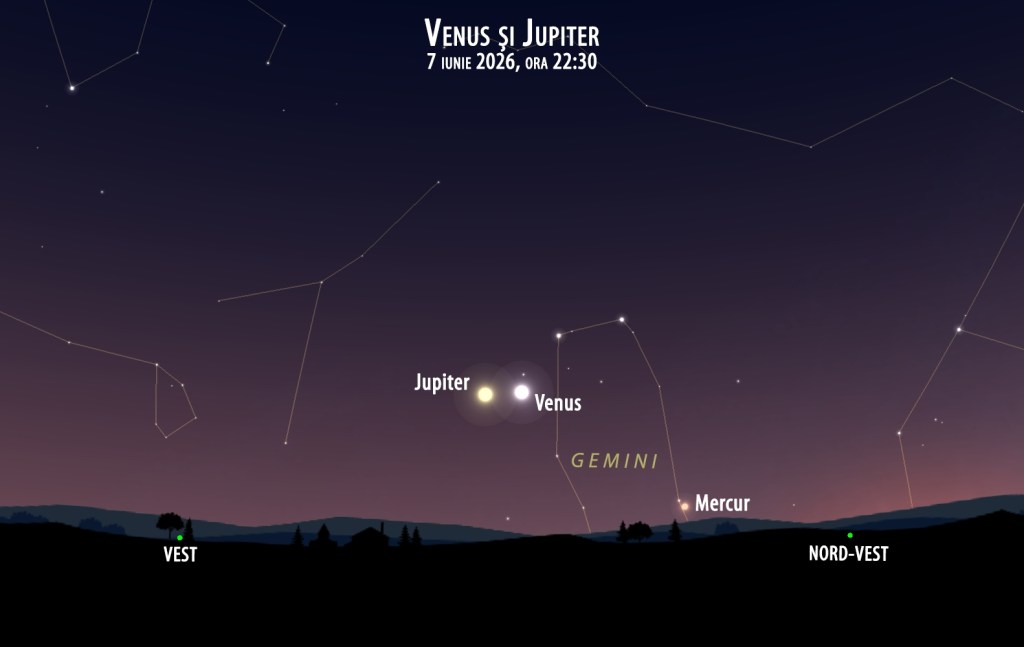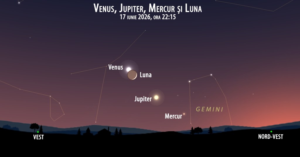 - de Jupiter în serile de 7 – 11 iunie; se văd seara, înspre apus, în jurul orei 21:30;