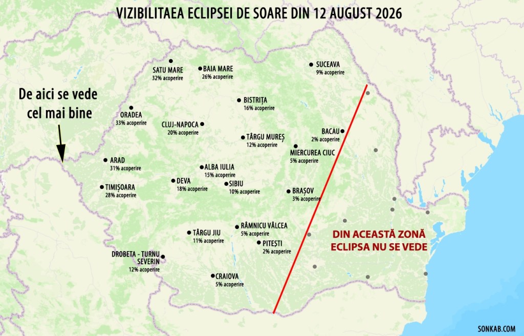 Frumos este că eclipsa se va vedea la apusul Soarelui. Din țara noastră, din locurile de unde se va vedea eclipsa, Soarele va apune în timpul eclipsei.