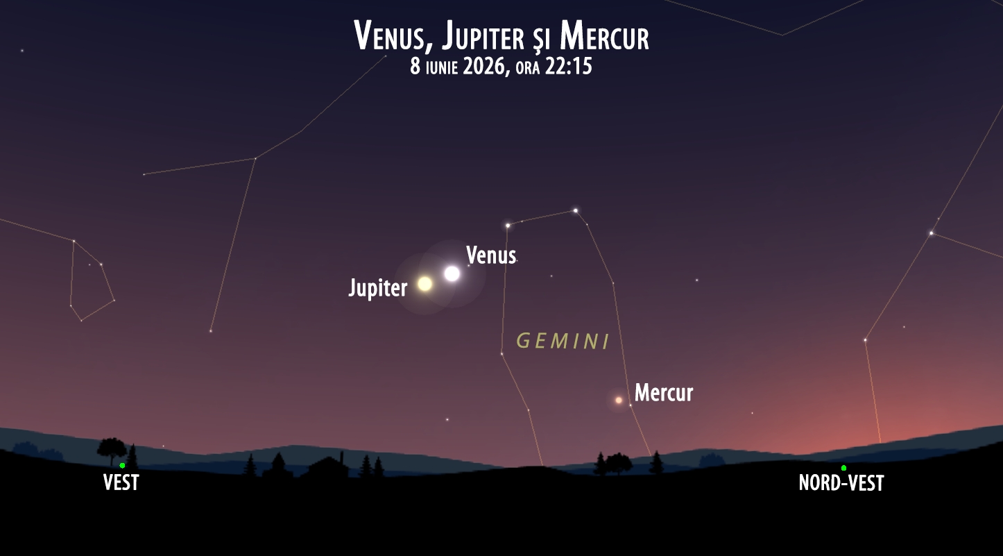 Între 6 și 11 iunie se pot vedea trei planete în aceeași parte a cerului: Mercur, Venus și Jupiter.