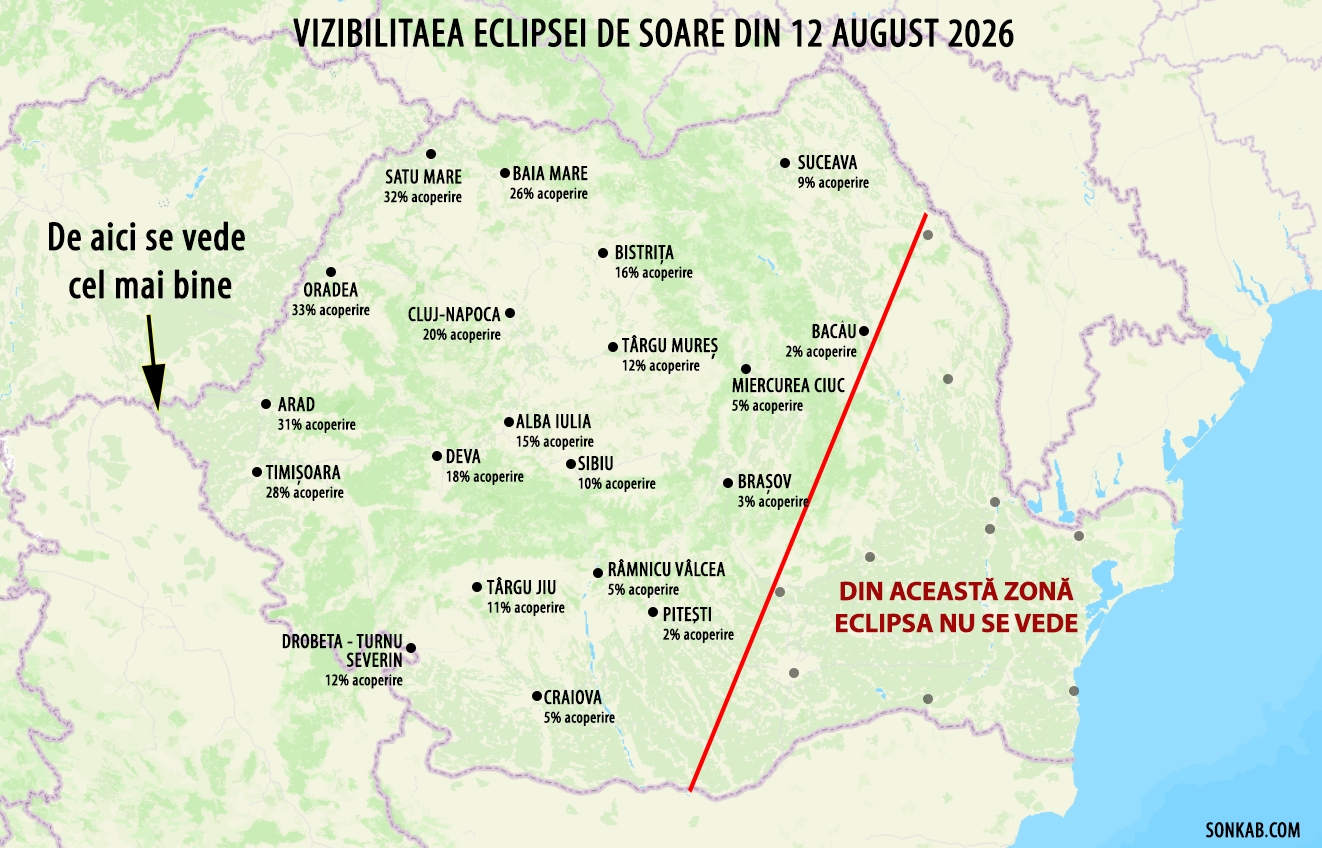 Frumos este că eclipsa se va vedea la apusul Soarelui. Din țara noastră, din locurile de unde se va vedea eclipsa, Soarele va apune în timpul eclipsei.
