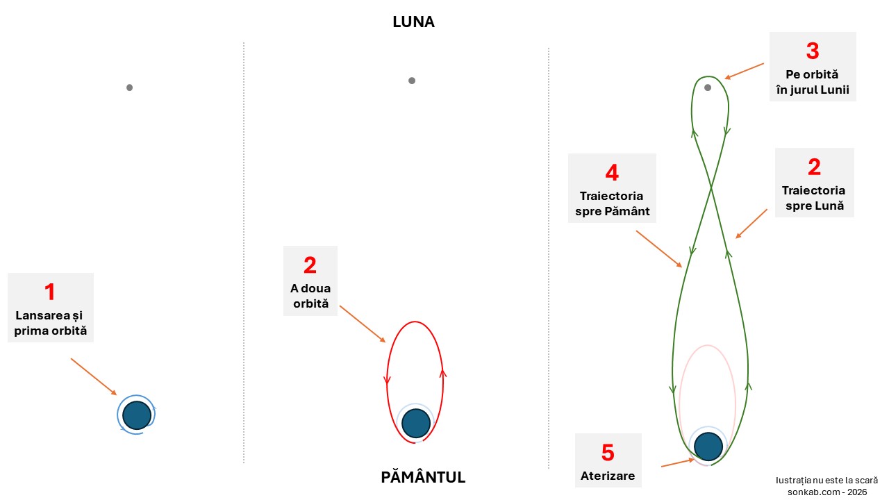Traiectoria capsulei va fi una normală, cu o lansare, două orbite în jurul planetei, o manevra trans-lunară, iar apoi gravitația Lunii îi va trimite pe astronauți înapoi înspre Pământ.