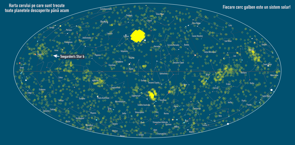 Am marcat pe hartă și planeta care seamănă cu a noastră în materie de masă și cantitate de lumină pe care o primește de la steaua ei. Se numește Teegarden b și se află în constelația Aries.