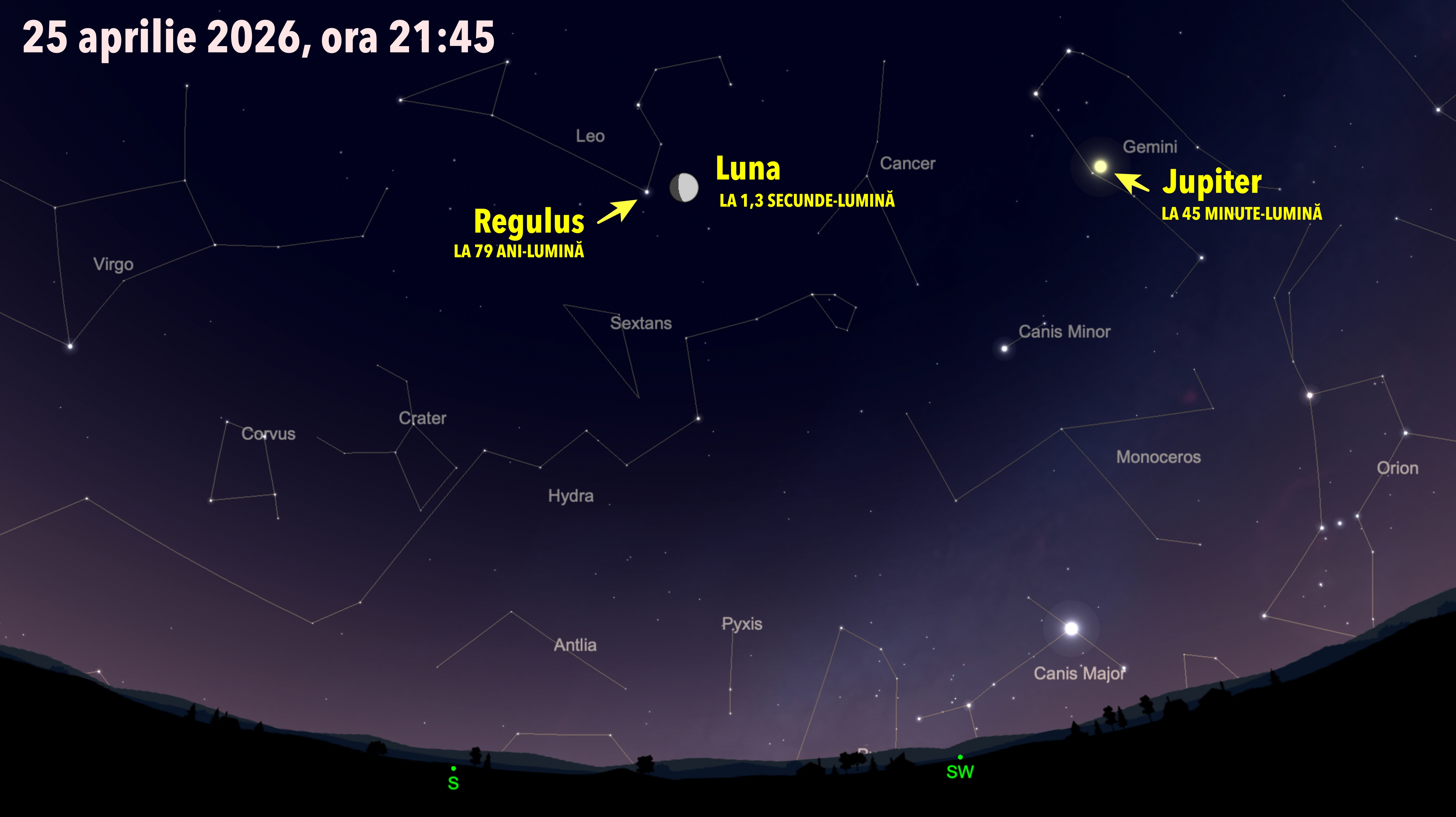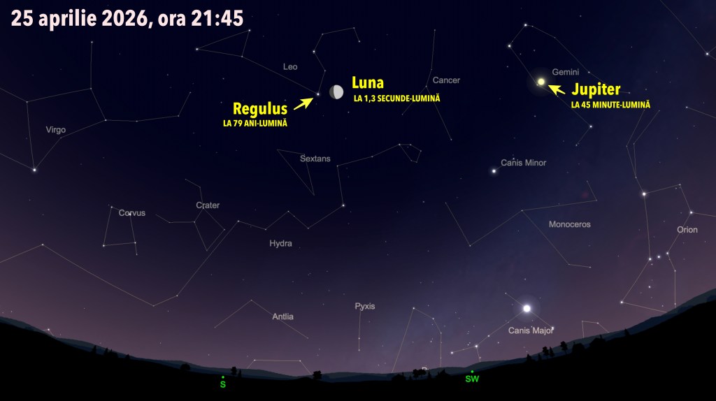În dreapta Lunii se află Jupiter, cea mai mare planetă din sistemul solar, de la care lumina ajunge în 45 de minute în ochii noștri.