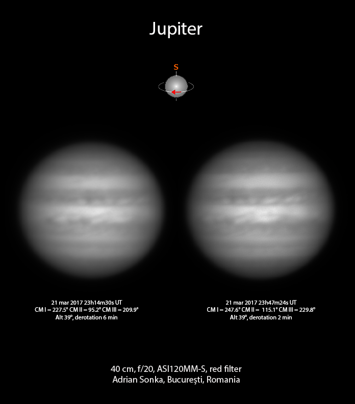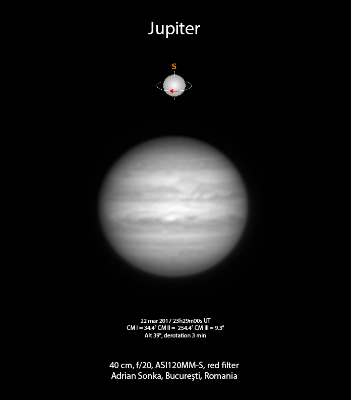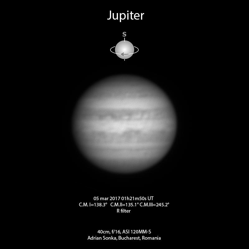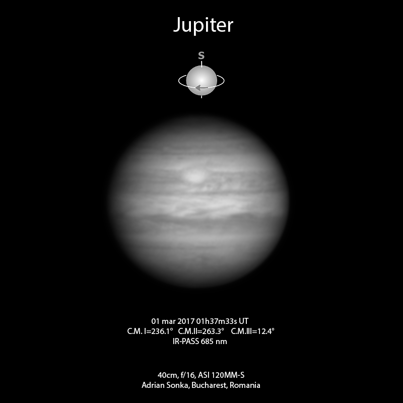 1 martie 2017 – Jupiter cu Marea Pată Roșie la merdian
